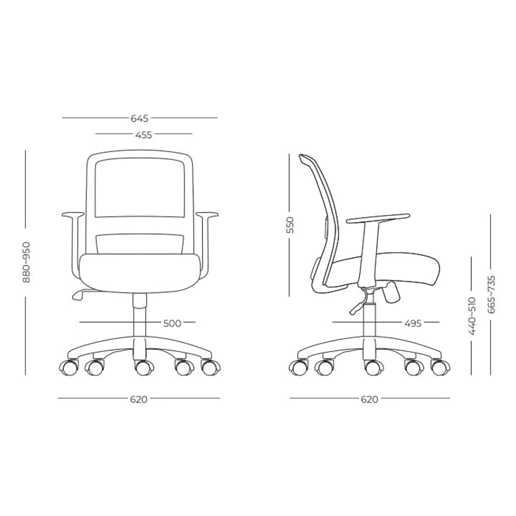 Os braços são feitos em nylon e possuem um botão de acionamento que permite a regulagem de altura, adaptando-se a diferentes usuários e mesas.